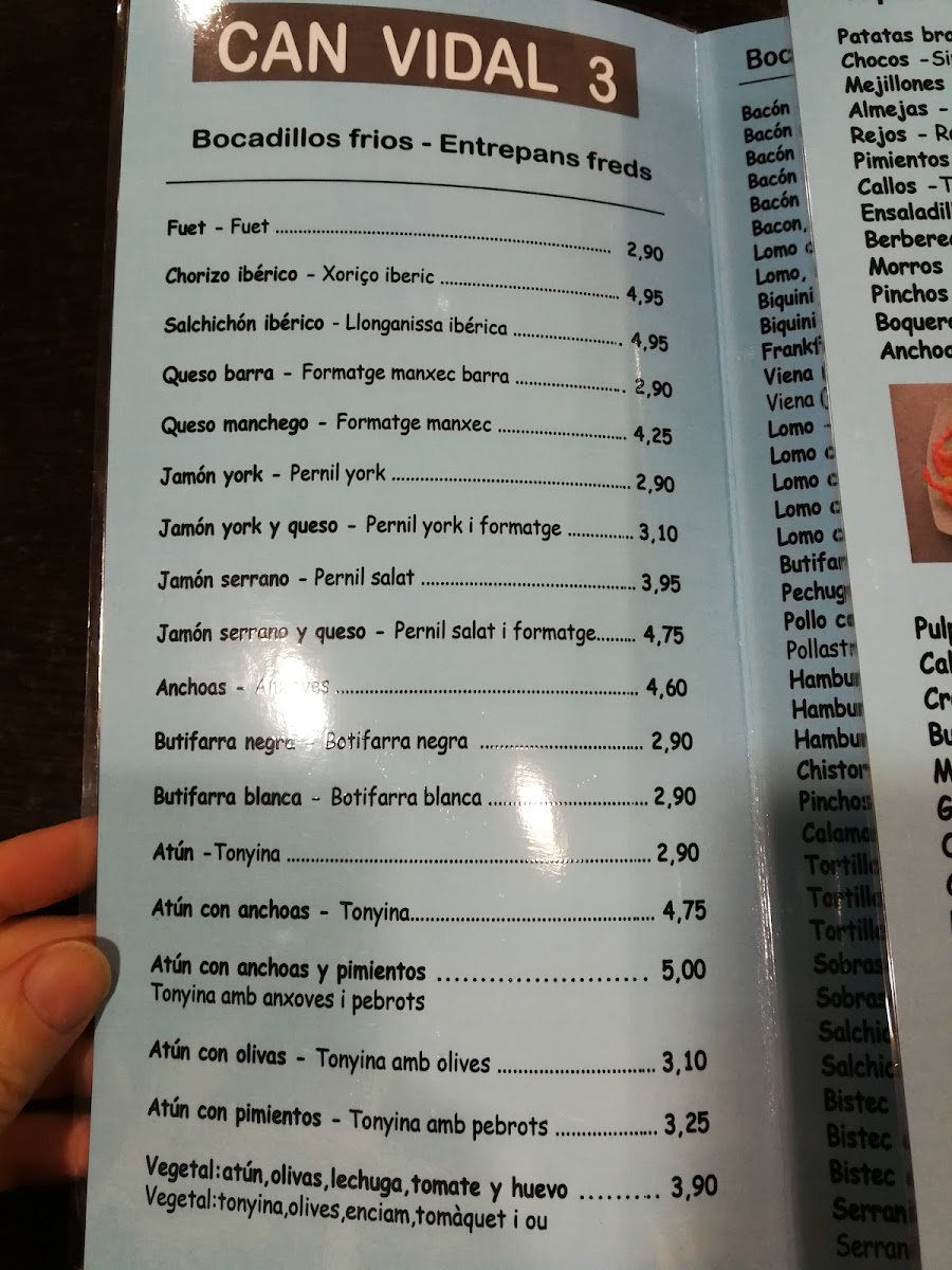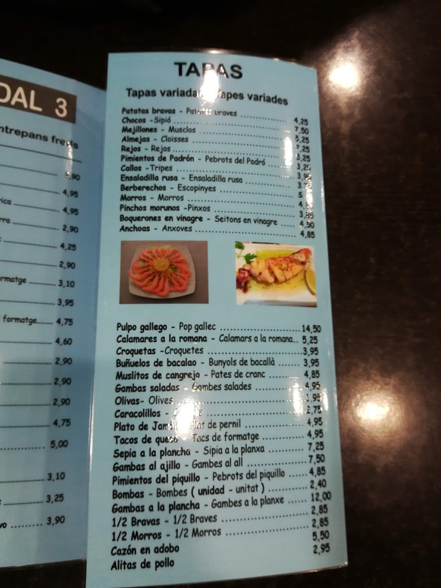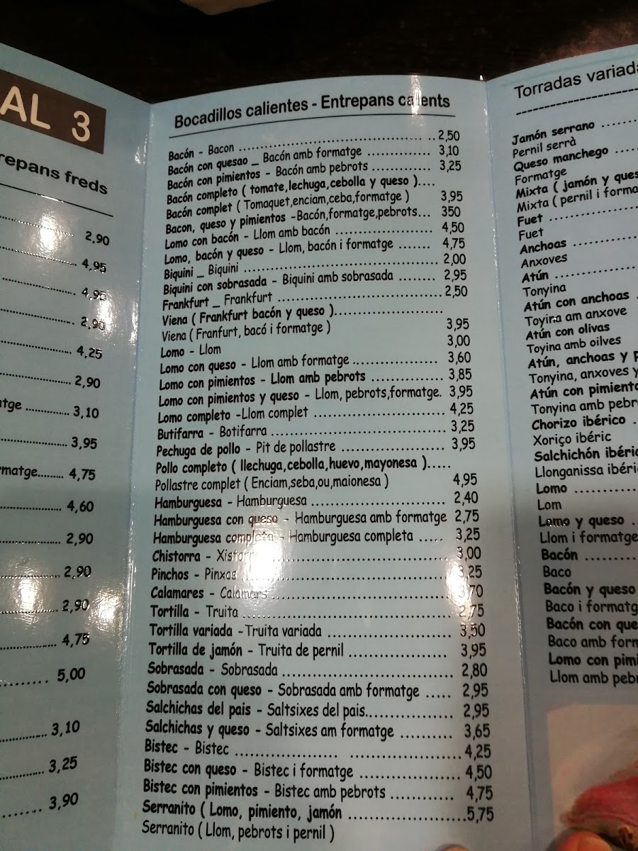 The menu at Restaurant Can Vidal 3 offers a straightforward and inviting selection of traditional tapas and casual bites, perfect for relaxed lunches or informal evening meals. You’ll find comforting classics such as patatas bravas and bocadillos served alongside a variety of small plates like morros and boquerón frito, making it easy to share and enjoy at your own pace.
